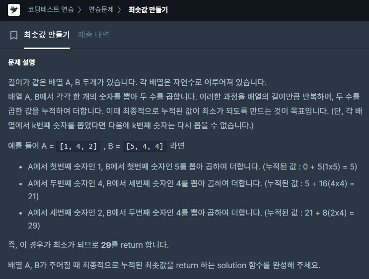 오늘의 문제는~ 2016년의 해당하는 날짜의 요일 구하기 였습니닷.저희 코드는function solution(a, b) { var answer = ''; const week = ["SUN", "MON", "TUE", "WED", "THU", "FRI", "SAT"] answer = week[new Date(2016, a-1, b).getDay()] return answer;} 이것이었습니닷!우선 요일을 가져와야 하는데 배열에 안 넣고 그냥 가져오게 되면 숫자를 가져와요!그래서 제가 원하는 형식으로 맞춰서 배열에 넣어 줬구요.answer 에서 그 해당하는 요일을 가져오기 위해 getDay() 를 사용해 줬습니닷!그럼 week[] 이 안에는 인덱스의 번호가 들어가게 되고, 그럼 제가 원..